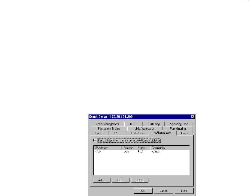 The authentications list defines the hosts that can carry out SNMP,