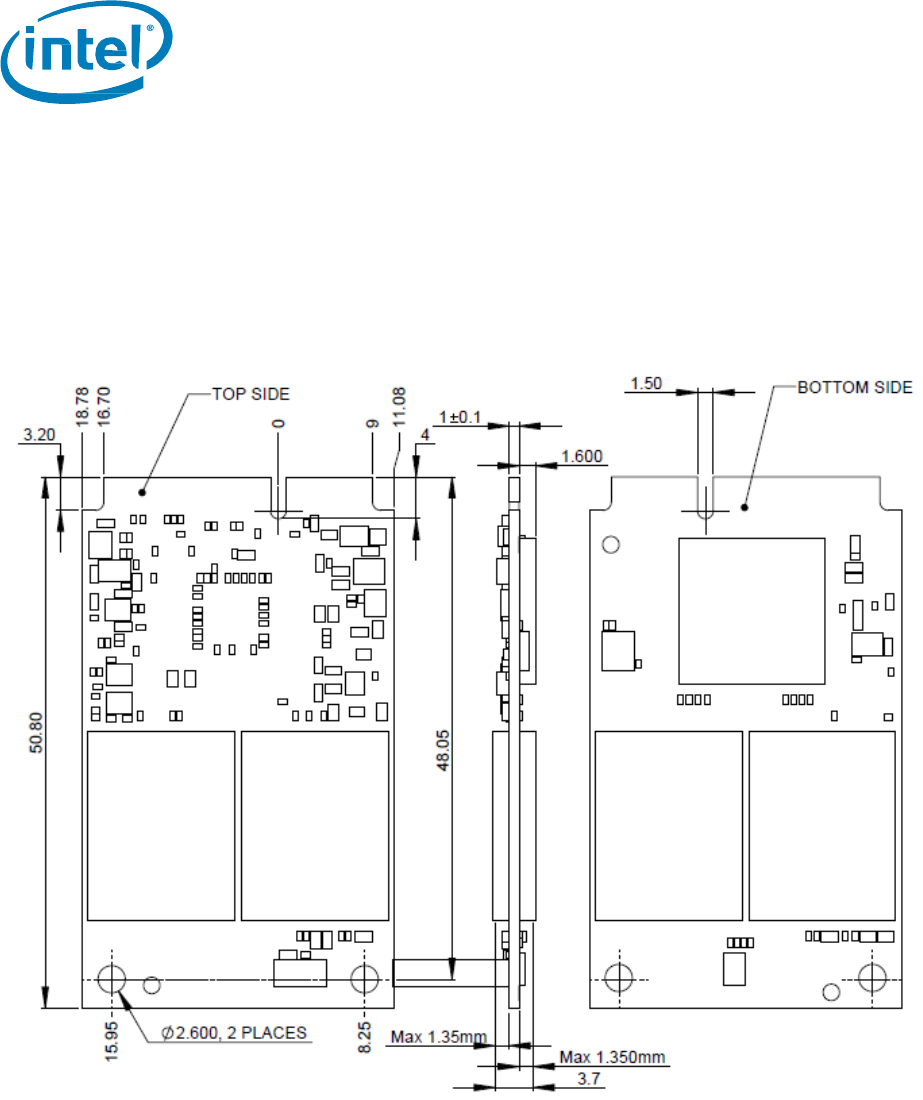 This figure shows the physical package information for the mSATA full size Intel SSD 525 Series. All